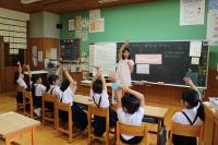 1年 英語 先生にインタビューをしています。誕生日や好きなものなどを尋ねています。
