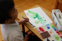 2年 図工 「びっくり動物」これまでに学習した絵の具の「わざ」をいかして描きました。