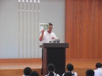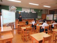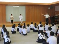 <小中学校> 今日は小学6年生と中学1年生合同で薬物乱用防止教室があり、学校薬剤師の松田さんから薬の正しい用法や体に与える影響等についてお話を聞きました。
