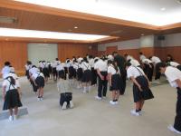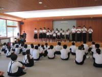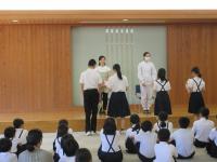 <小中学校> 本日で1学期が終了しました。終業式の前には、夏休みに行われる輪島中との交流で歌う校歌等の練習をしました。離任する職員へ子供たちからメッセージやお花の贈呈も行いました。