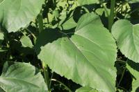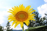 「福島ひまわり里親プロジェクト」 開花4日目 連日の猛暑ですが、ヒマワリの花は東の空の方を向いて元気に咲いています。今日の花は青空に映えてとてもきれいです。葉は人の顔の大きさと同じくらいです。
