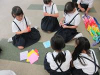 「平和集会」 図書委員が「トットちゃんの15つぶのだいず」を読み聞かせしました。折り鶴をみんなで折りました。