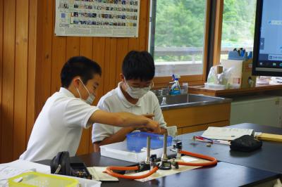 理科 モリアオガエルの卵を観察しています。学校の池に卵を毎年産みます。おたまじゃくしに成長すると、重力で池に落るような位置に、泡で包んだ卵を産んでいます。