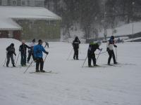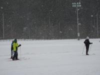「クロスカントリースキー授業」 3・4・5・6年生は、クロスカントリースキーを体験します。今回は学校のグラウンドで練習です。雪の降る中、何周も滑っています。地域の方や保護者の方に教えていただきます。