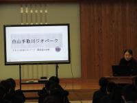 朝講話 ジオパーク学習で学んだことを白嶺祭で各学年発表しましたが、ジオパークを地球の変化の歴史及び日本の誕生と地質遺産の関係からより深く学びました。