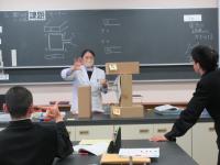 2年 理科 モーターの仕組みについて、先生が段ボールで手作りしたモーターのモデルを使って学習を深めています。