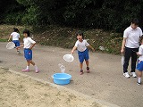 運動会の団に分かれて、かごの中にエコキャップを入れ、制限時間内に3㎏に一番近く入れたグループが勝ちというルールです。