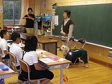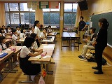 あいさつ集会で説明する企画委員 海友会の班で集まって話し合い