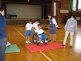 説明をお聞きした後、腰が曲がったときや、白内障になった時はどのような変化が起こるのかを疑似体験したり、車いすを押して段差があるとどのようになるのかといった体験をしたりしました。