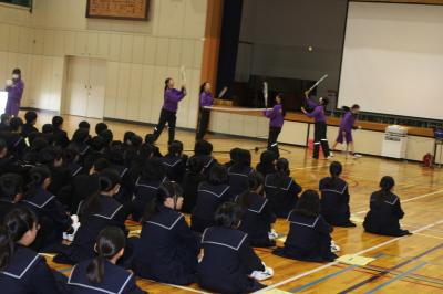 まずは、ふだんの練習の様子を紹介していただき、そのあと最新の演技を披露してくれました。続いての体験会では、本校の生徒達が実際にバトンを手に取り、回したり投げたりと、バトントワリングの楽しさを味わうことができました。最後には、ミュージカルの音楽に合わせて、華やかで迫力のある演技をもう一度披露してくださり、会場は大きな拍手に包まれました。