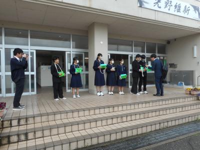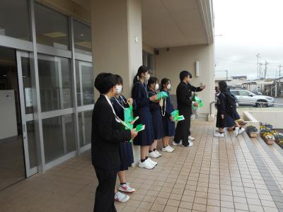 朝、グッドマナーキャンペーンでPTA役員が生徒玄関で生徒達にあいさつをして出迎えました。
