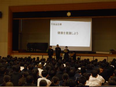 今日は自主自立集会がありました。生徒会役員からは「健康を意識しよう」という目標のもと、手洗いやうがいなど気をつけて、風邪やインフルエンザを予防しようと声かけがありました。