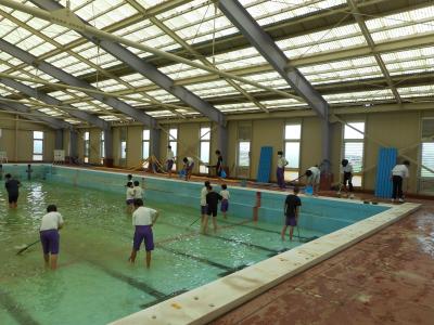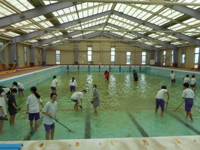 来週から始まる水泳の授業に向けて、プールの清掃を行いました。生徒達は楽しみながら一生懸命に汚れを落としていました。きれいなプールで泳ぐのが楽しみですね。