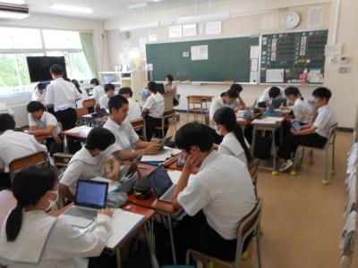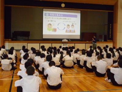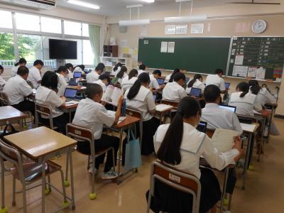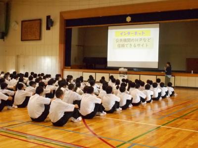 1年生の総合的な学習の時間では地域調べをしています。今日は、調べ学習を進める上での注意点やテーマの決め方、参考文献の記載や著作権について学校司書から話を聴きました。