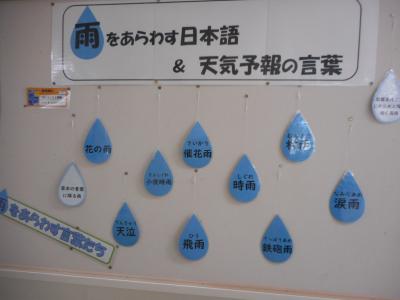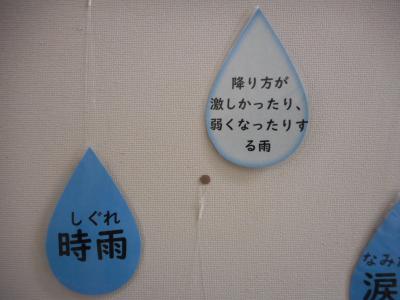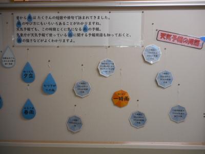 図書館前の掲示板にはいつも季節や時期に応じた掲示がされています。現在は「雨を表す日本語&天気予報の言葉」が掲示されています。「村雨」「小夜時雨」など、雨を表す言葉は美しいものが多いような気がします。