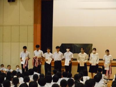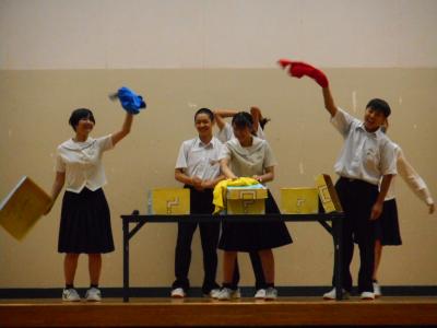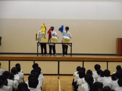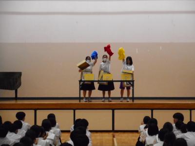 今日の午後に、表彰披露と運動会の団決め集会を行いました。3クラスの3年生に合わせて1,2年生はクラスの中でA,B,Cの3つのグループに分かれ、本日赤、青、黄の団に決まりました。赤団3年1組 青団3年2組 黄団3年3組 です。