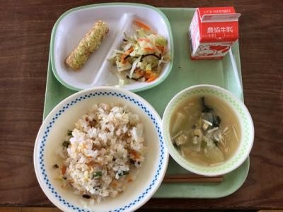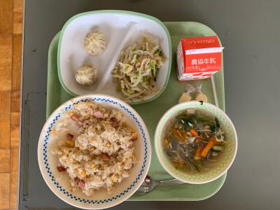 給食ではチャーハンを大量に作るため,中華味で炒めた具材をご飯に混ぜて作ります。具材を変えることでいろんなアレンジができます。今日は焼き豚が入ったチャーハンです。