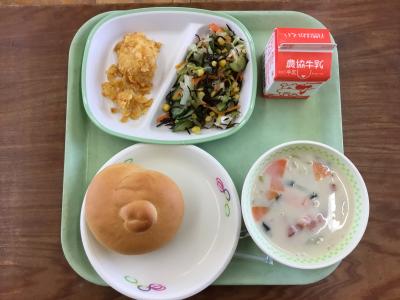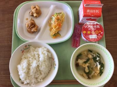 ヨーグルトは牛乳に乳酸菌を植え付けて固めたものです。栄養は牛乳と同じようにタンパク質やカルシウムがいっぱいです。給食ではフルーツといっしょにヨーグルトあえにしました。