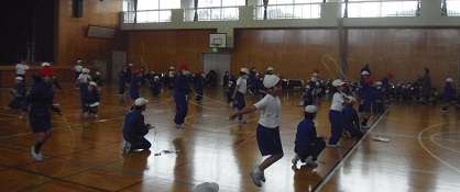 2月13日(水),校内なわとび大会を行いました。個人種目(1人3種目),団体種目(8の字跳び:学年,みんなでジャンプ:縦割り班)がありました。個人種目では,どの児童も数を数えてくれる人に「お願いします。ありがとうございました。」も言い,一生懸命跳びました。