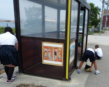 国道160号線にあるバス停「東湊小学校前」を日頃から乗降する児童3名が掃除しました。1ヶ月に1回,草刈りや壁面の汚れ落としをします。以前から行っており,昨年度は国土交通省より感謝状をいただきました。