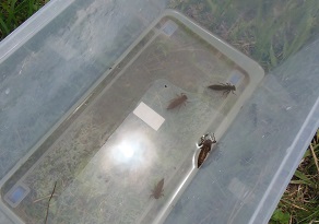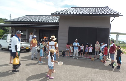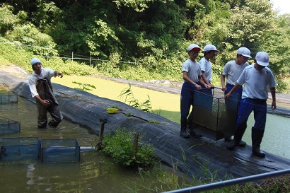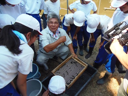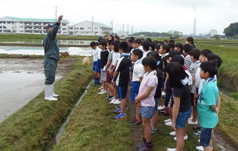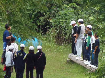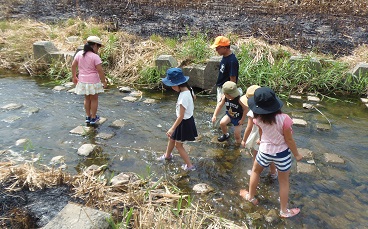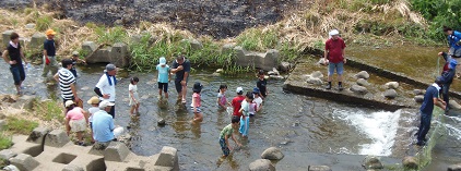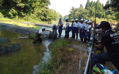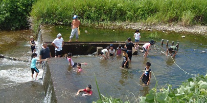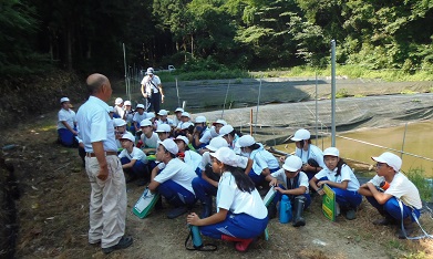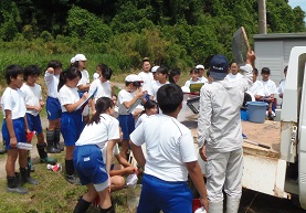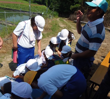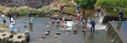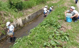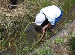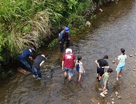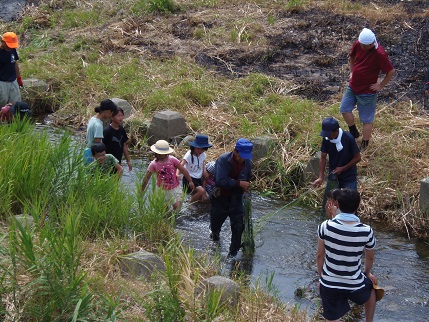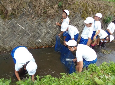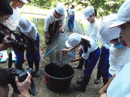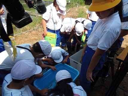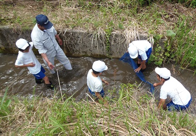 学校より1km上流。5年生が水生生物の採取を行いました。ザルやタモを使って歓声をあげながらつかまえました。ドジョウ,よしのぼり,ヤゴ,サンショウウオなど,めずらしい生物を観察したり採取したりしました。