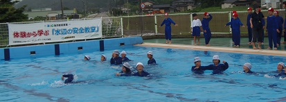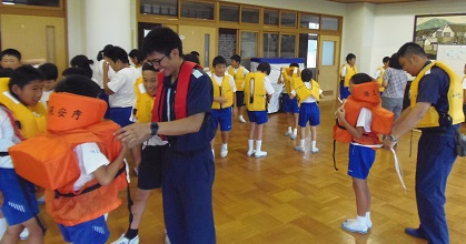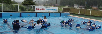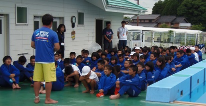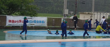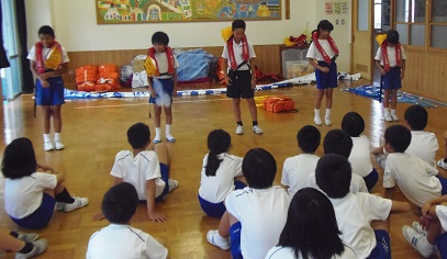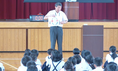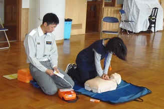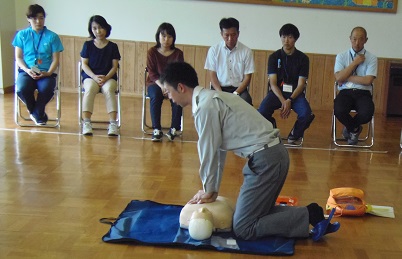 児童がおぼれたら,心肺機能が突然停止したら・・・。いざというときに正しく操作できるように専門家を招いて講習会を行いました。AED(自動体外式除細動器)を,職員玄関から体育館入り口に移動しました。