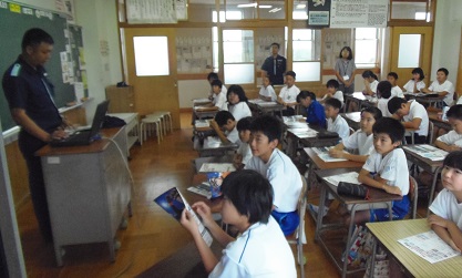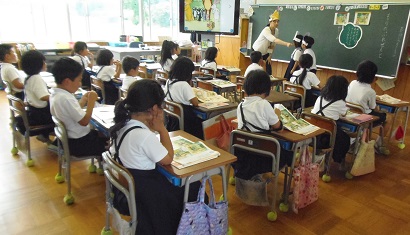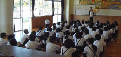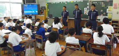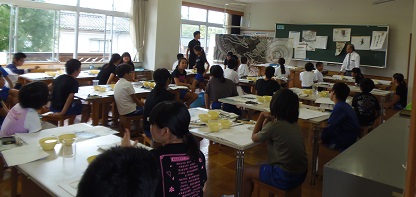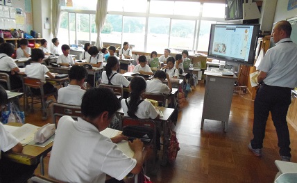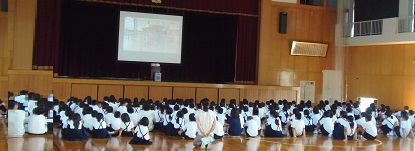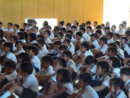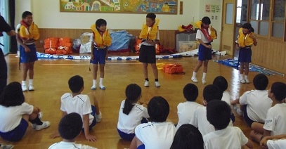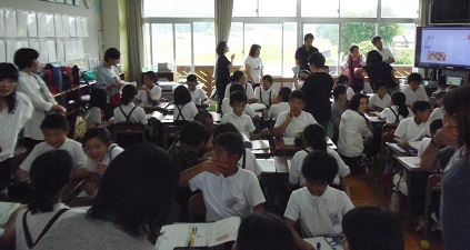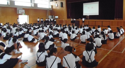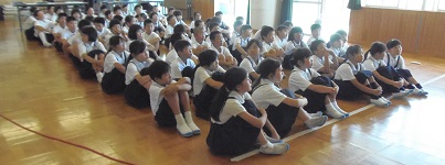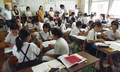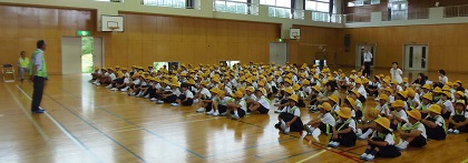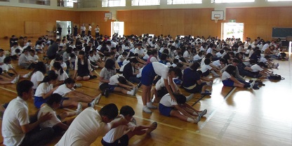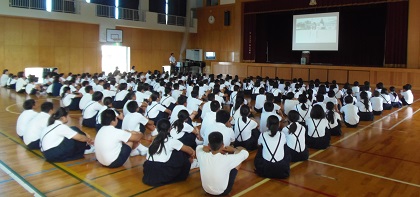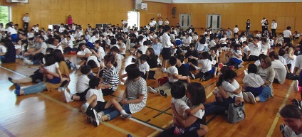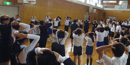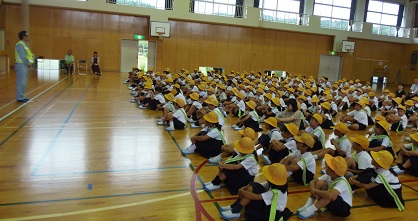 7月3日(木)10時10分,長休み時間。校内放送の指示により全員が教室に避難しました。県内にも原子力発電所があります。真剣に避難できました。