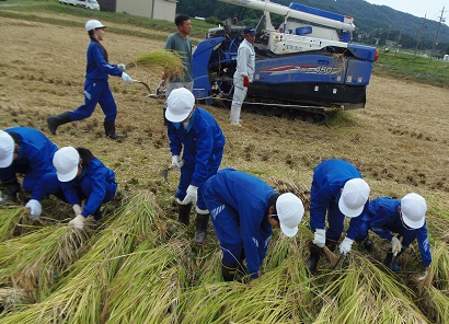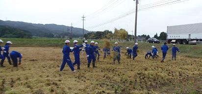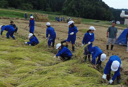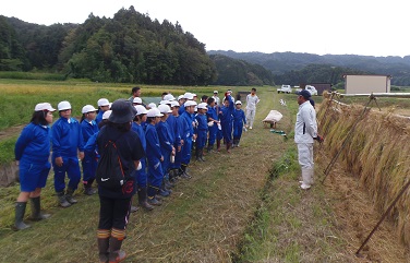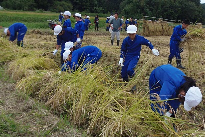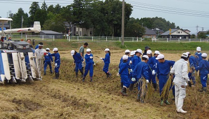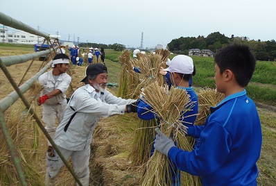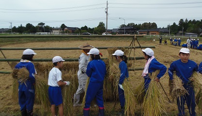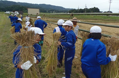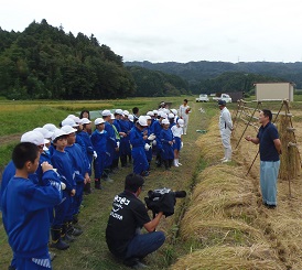稲刈りが初めての子が多く,鎌で稲を刈るのも最初はおそるおそるでしたが,次第に慣れてきてスムーズに刈れるようになりました。ハザかけの体験もしました。