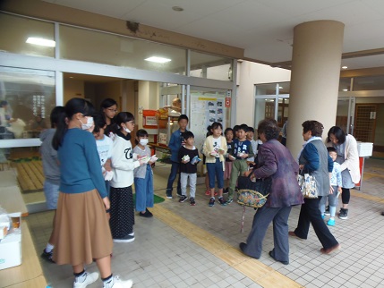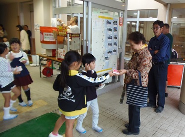 出演の前に,子どもたちは,見守りして下さっていることに対する感謝を込めたメッセージ入りのポケットティッシュを地域の方に配りました。