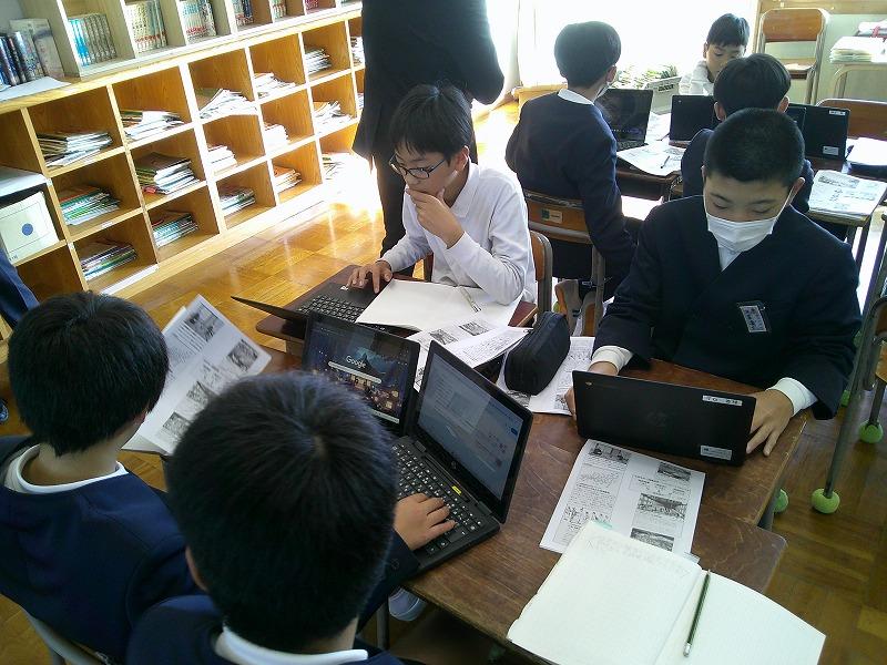 | 既習と自分の予想を基に,江戸時代から明治時代への大きな変化の原因について調べ,考える。資料は教師が用意したものを使う。その際,ぐんぐんタイムでの活動の視点を明確にし,変化に関わっている人物,歴史的出来事,政治改革,人物の思いなどから自分の考えを構築していく。ぐんぐんタイムを通して,今の生活とのつながりに着目しながら,明治時代の変化が現代にどう関わっているのか,どう影響しているのを考え,自分なりの考えを表現できるようにする。また,本時の最後には,ICTを使って自分の考えや立場を明確化し,意図的な交流を促す。 |