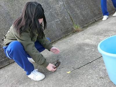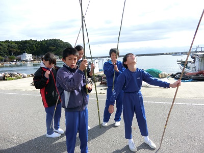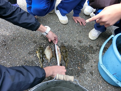 地域の方が作ってくださった竹竿で行いました。つりが初めての子が多く,魚が食いついたときの引きの手応えや実際に釣り上げたときの手応えを感じていました。