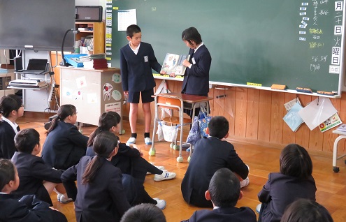 11月20日(火)の朝,委員会活動の一環として図書委員が1年生,2年生,5年生に読み聞かせをしました。「もこもこの会」の方が定期的に読み聞かせをしていただいていますが,児童が読み聞かせをするのもいいですね。