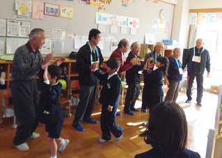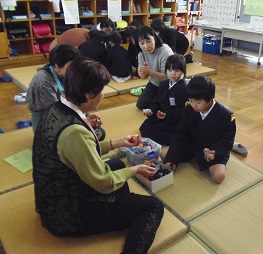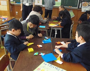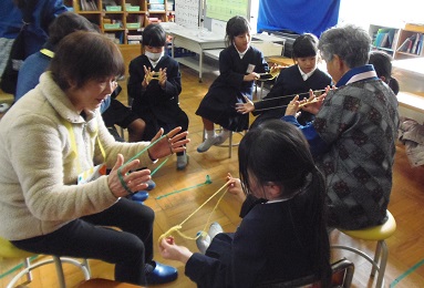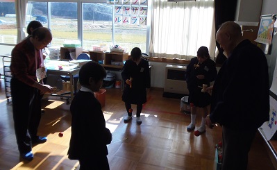 12月17日(月),1,2年生が,自分たちのおじいちゃんやおばあちゃん,それに東湊老人会の皆さんと一緒に遊ぶ「ふれあい集会」を開きました。