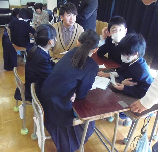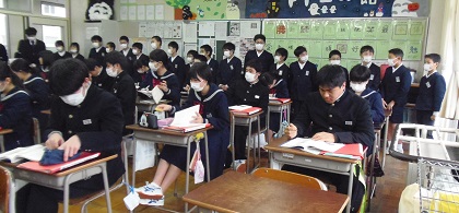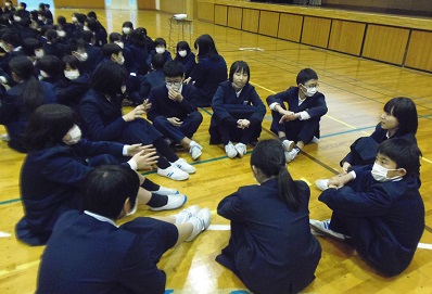 1月23日(水),6年生が,七尾東部中学校へ行き,小中ふれあい集会に参加しました。授業見学や中学校説明(プレゼン),学校間交流(山王小・天神山小の6年生と)をしました。中学2年生の生徒会の皆さんが色々企画し進行してくれました。