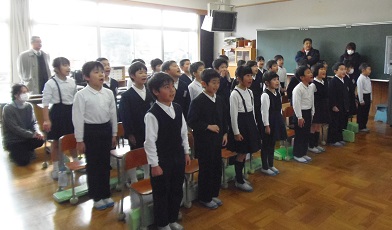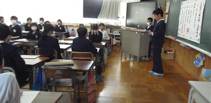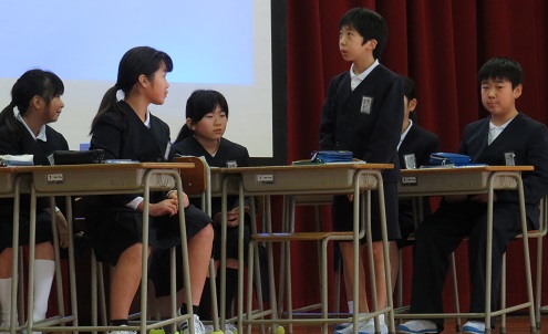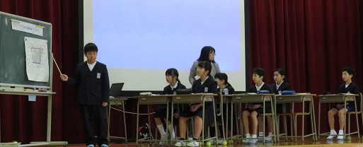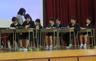 2月6日(水)の全校集会で,5年生の代表が授業中の聞き方・話し方などの見本を全校児童の前で示してくれました。