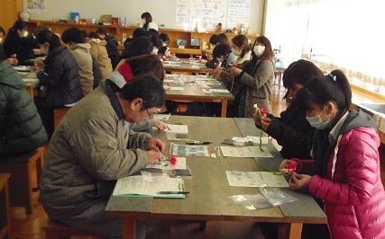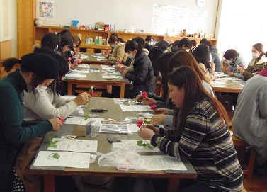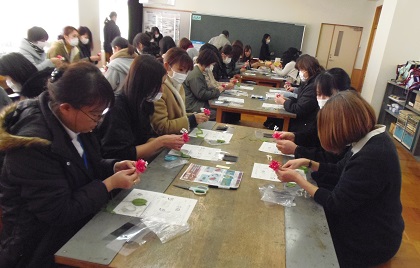 その後,保護者の方が,我が子のために卒業式のときに胸につけるコサージュを心を込めて作りました。メッセージも添えるそうです。