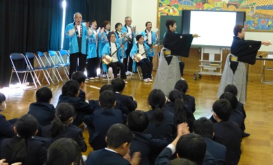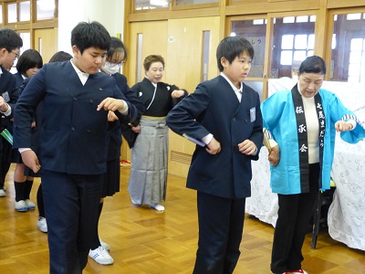 2月5日(火),6年生が「七尾まだら伝承会」の皆さんから,七尾まだらの由来とルーツなどの説明や歌・踊り・三味線を披露してもらいました。その後,扇子の持ち方や足の運び方などを教わりました。地域に伝わる代表的な伝統文化にふれることができました。中学校に進学すると,運動会で七尾まだらを踊るようです。少しでも教えていただき,良かったのではないでしょうか。