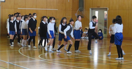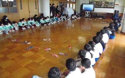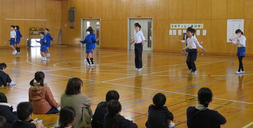 また,体育委員会のメンバーが,なわとびの技を,6年生が8の字を披露してくれました。13日(水)に行われる「校内なわとび大会」に向けての意識付けにもなりました。