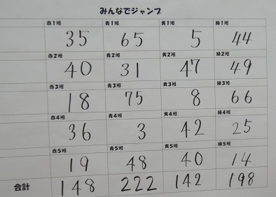 団体種目では,学年・縦割りで声を掛け合いながら大縄を跳びました。