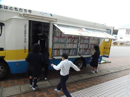 本校には,月に2回(偶数学年,奇数学年が借りられる)「本はともだち号」が来て,子どもたちが本を借りています。色々な本があるので,子どもたちは楽しみにしています。