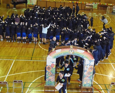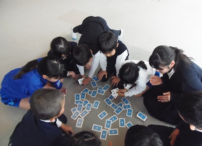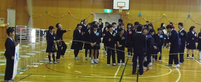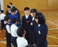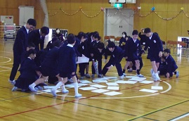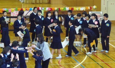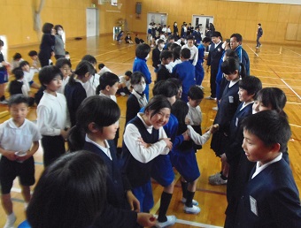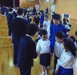 3月12日(火),今年度最後の縦割り班での遊び「絆タイム」を行いました。それぞれの班毎に思い思いの遊びをしました。最後に,班の1~5年生が一人一人,班の6年生と感謝の思いを込めて握手をしました。