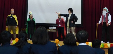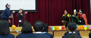 3年生の出し物 生まれ月ごとに6年生が立つ