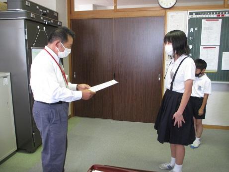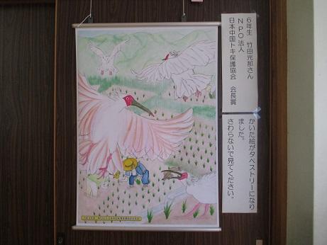 4年生と6年生が取り組んで応募した「トキの絵コンクール」で入賞した人たちに、協会の方が来てくださって賞状を手渡してくださいました。本校からは4人の人が選ばれ、賞状をいただきました。その中で6年生の竹田さんの絵をタペストリーにしてくださいました。とてもダイナミックで素敵な絵です。しばらく校長室前に飾って全校児童に見てもらいました。
