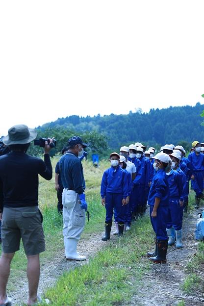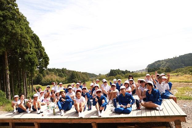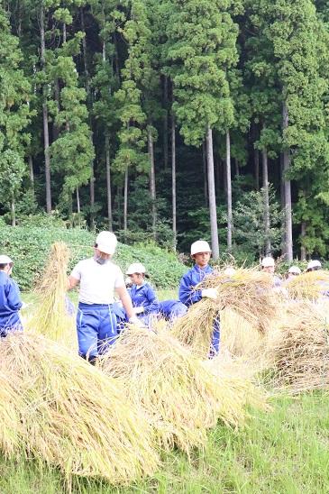 5月に田植え体験した大吞の棚田の稲刈りに5年生が行ってきました。地元の農家の方にやり方を教えていただいた後、それぞれに分かれて鎌で稲刈りをする体験をしました。1時間弱刈った後は、青空の下でおいしいおにぎり弁当をいただきました。多くの子が初めての体験でしたが、汗をかきながらもくもくと稲を刈っていました。