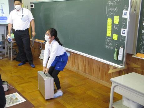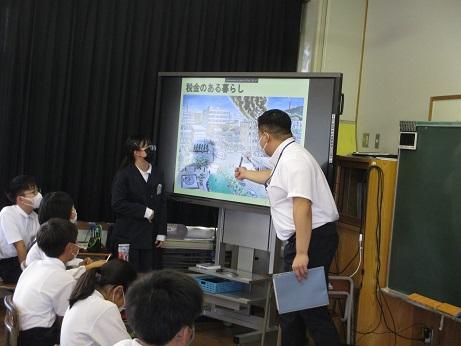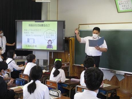 七尾市税務署の職員の方をお招きして、6年生対象の租税教室が開かれました。丸ばつクイズをはさんで興味関心を喚起しながら税の種類や使われ方、もし税金制度がなかったらどうなるかなどを学習しました。1人1人がケースを持ち上げて1億円の重さを体感してみるコーナーもありました。