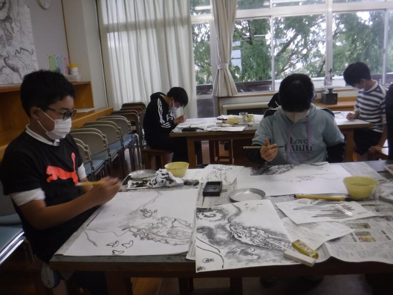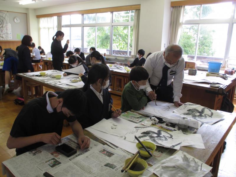 6年生が水墨画に挑戦しました。炭の擦り方や色の重ね方などを講師の橋元先生に教えていただきながら、長谷川等伯の龍虎図などを描きました。初めてではありましたが、どの作品も水墨画らしい味のあるものに仕上がりました。1月にパトリアで展示される予定です。