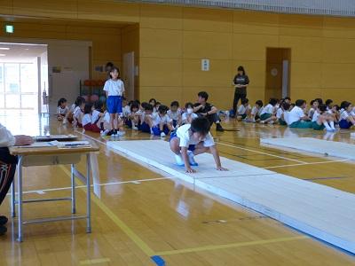 山王小学校の体育館に本校含めた5校の児童が集まって器械運動交歓会を行いました。種目は跳び箱、鉄棒、マットの3種目です。これまでの練習の成果を発揮するべく、子どもたちはきびきびと技を披露していました。