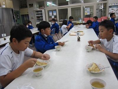4年生が鹿島少年自然の家でSDGsについて学習してきました。中でも「落下りんごを使ったアップルパイづくり」の活動では、班で協力しながらアップルパイを作り、熱々をおいしくいただきました。お店に出せないリンゴも形を変えて生まれ変わらせることによって使えることを、身をもって学習したようです。