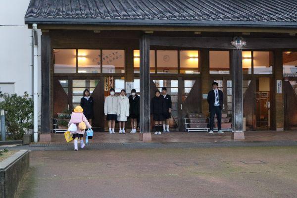 富永公民館、富永まちづくり推進協議会の方々による左義長に、全校児童で参加しました。天候が不安でしたが、ちょうど会が始まる前に晴れました。