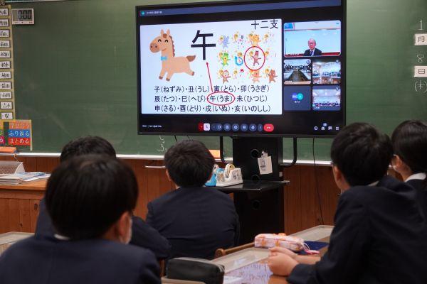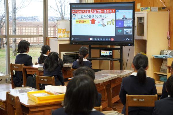 始業式は、教室でリモートにより実施しました。校長先生の話では、今年の干支「丙午(ひのえうま)」にちなみ、目標に向かって一歩進むこと、仲間と力を合わせることを通して、「力強く進む「進年」にしていきましょう!」とありました。良い一年にしたいですね。